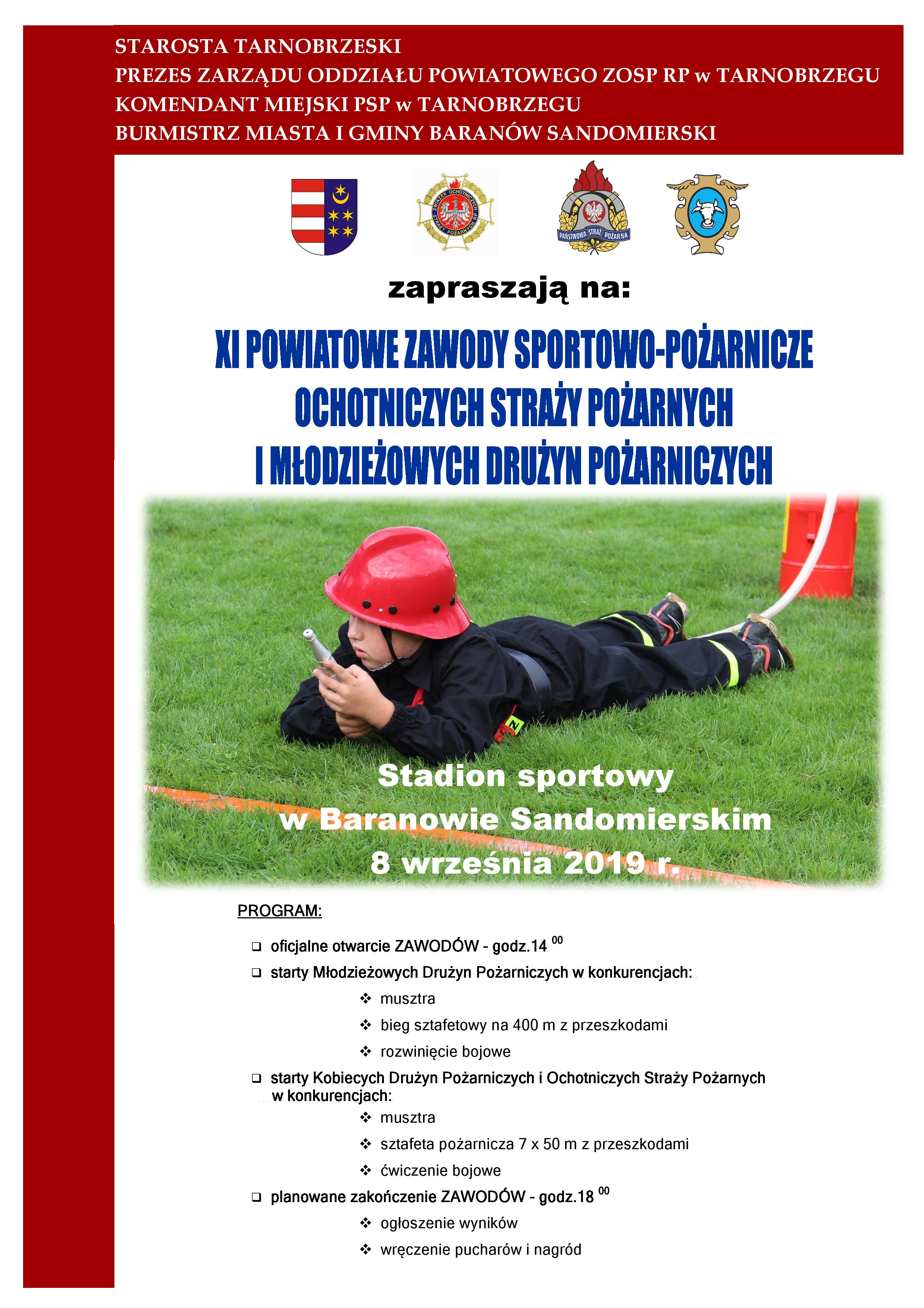 Komenda Miejska Państwowej Straży Pożarnej w Tarnobrzegu informuje, że w dniu 8 września 2019 r. na stadionie sportowym w Baranowie Sandomierskim zostaną przeprowadzone XI Powiatowe Zawody Sportowo - Pożarnicze Ochotniczych Straży Pożarnych i Młodzieżowych Drużyn Pożarniczych.