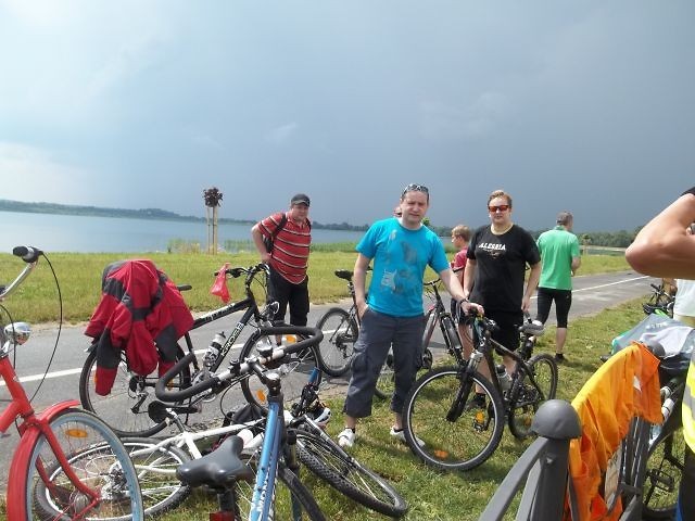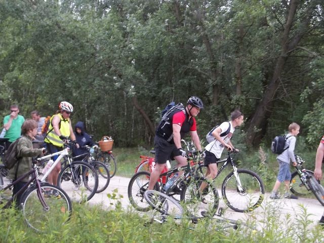 Wycieczka okazała się wyprawą w słońcu, deszczu (ulewie) i w chmarze komarów. Przejechaliśmy 62 km - trasa wiodła przez Rozalin, Dąbrowicę, Strefę Machowską, dookoła Jeziora Tarnobrzeskiego i przez "zwałkę" Machowską. Po drodze zwiedziliśmy w Chmielowie mały cmentarz z 1915r, na którym spoczywają żołnierze armii austro-węgierskiej.