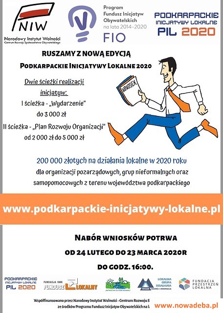 Fundacja Fundusz Lokalny SMK, Lokalna Grupa Działania Stowarzyszenie „Partnerstwo dla Ziemi Niżańskiej”, Stowarzyszenie Lokalna Grupa Działania „Trygon – Rozwój i Innowacja” oraz Fundacja Przestrzeń Lokalna informuje o otwarciu naboru wniosku w ramach projektu Podkarpackie Inicjatywy Lokalne 2020.