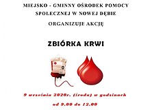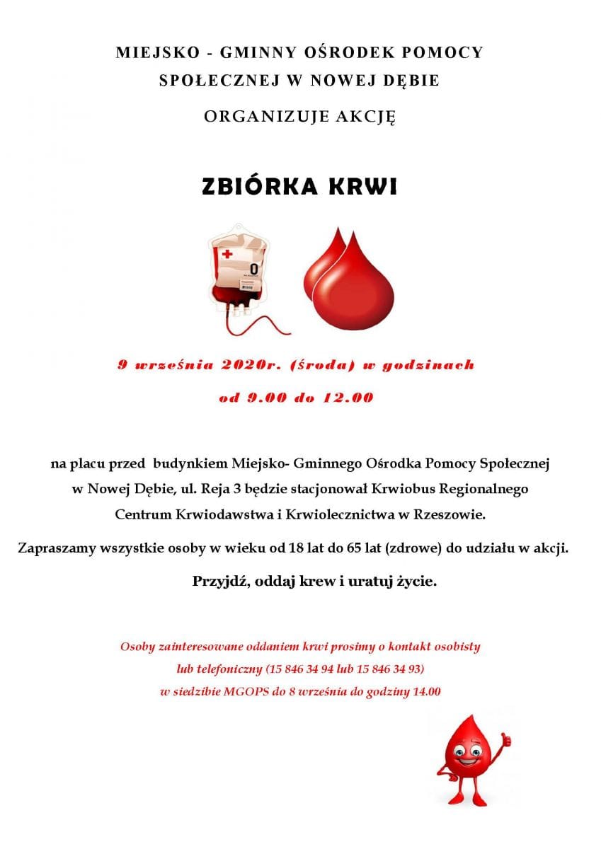 W środę 9 września 2020 r. w godz. 9-12 na placu przed Miejsko-Gminnym Ośrodkiem Pomocy Społecznej w Nowej Dębie będzie stacjonował Krwiobus Regionalnego Centrum Krwiodawstwa i Krwiolecznictwa w Rzeszowie.