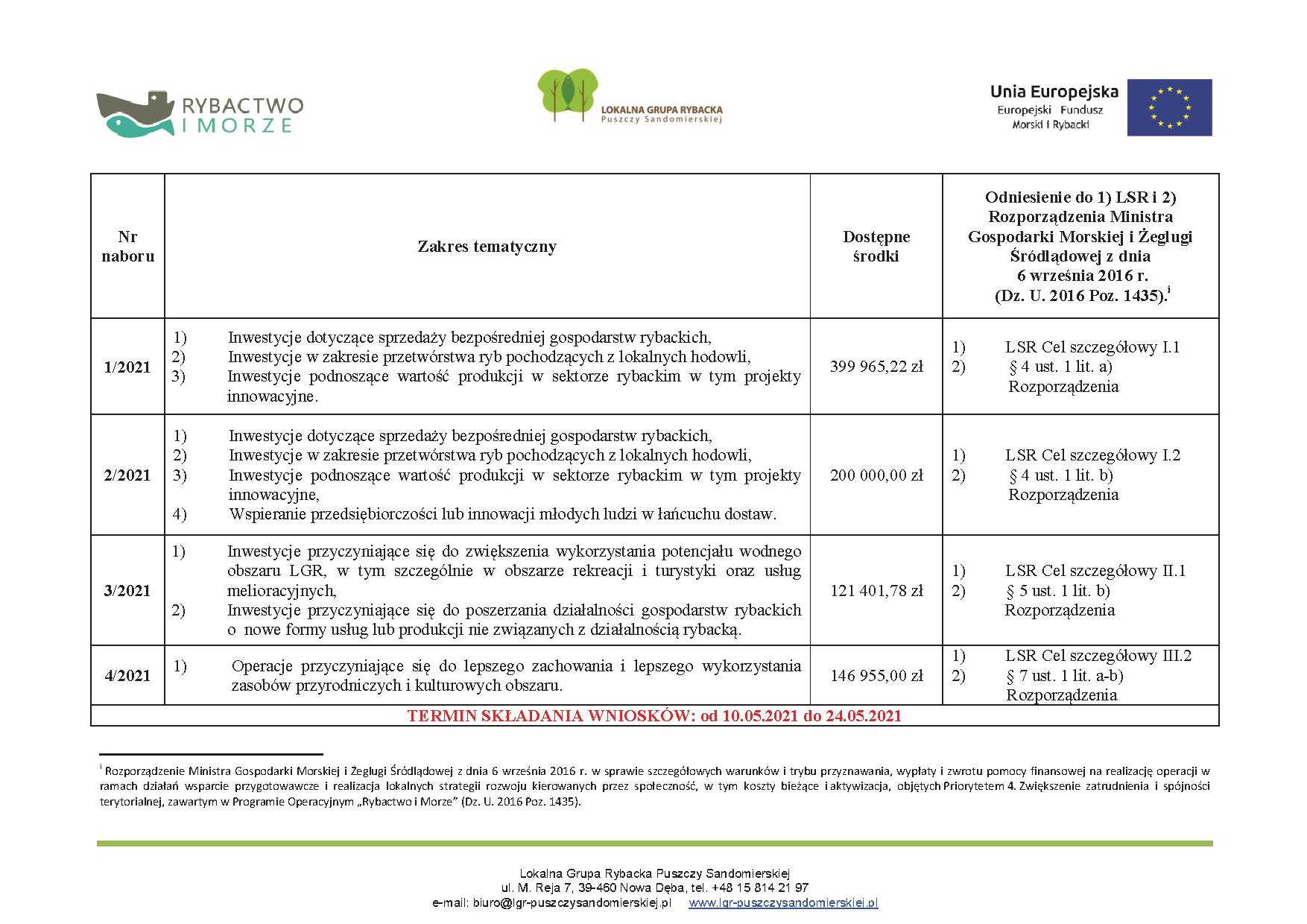 Miejsce składania wniosków: Biuro Stowarzyszenia "Lokalna Grupa Rybacka Puszczy Sandomierskiej" ul. M. Reja 7, 39-460 Nowa Dęba.