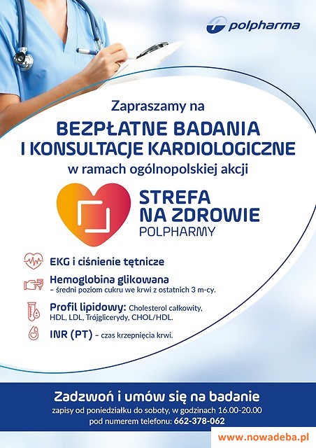 29 sierpnia w Nowej Dębie odbędą się bezpłatne badania Strefa na Zdrowie Polpharmy. To część ogólnopolskiej akcji bezpłatnych badań zainicjowanych przez firmę Polpharma. Akcja jest odpowiedzią na potrzeby pacjentów, którzy w trakcie pandemii nie mieli i wciąż nie mają dostatecznego dostępu do specjalistów i terapii. W 8 miastach w Polsce: Pabianice, Starogard Gdański, Sieradz, Nowa Dęba, Leszno, Ełk, Wałbrzych i Nowy Sącz mieszkańcy będą mogli skorzystać z bezpłatnych badań o profilu kardiologiczno-diabetologicznym.
