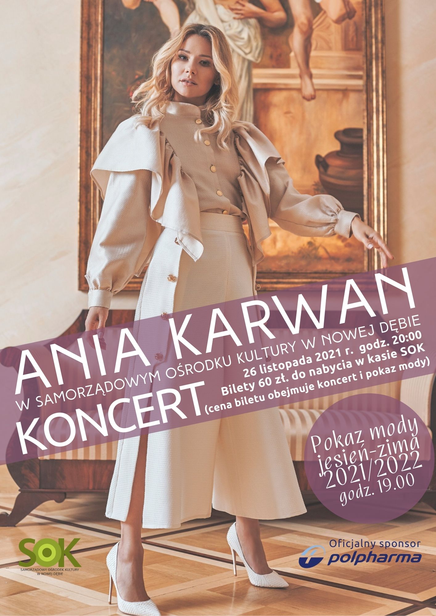 ANIA KARWAN - zwyciężczyni konkursu Premiery 56 Festiwalu Polskiej Piosenki w Opolu. Przebój „Słucham Cię w radiu co tydzień” przyniósł Artystce aż trzy nagrody - za najlepszy tekst, kompozycję oraz nagrodę główną jury w konkursie „Premiery”. W 2020 roku utwór uzyskał również status podwójnej platynowej płyty. Debiutancka płyta Ani ukazała się 15 lutego 2019 r.dając fanom Artystki też takie przeboje, jak „Głupcy” który pokrył się platyną, czy „Czarny Świt” uhonorowany złotą płytą. Artystka została nominowana do Fryderyków 2020 w kategorii „Fonograficzny debiut roku”, a w 2021 płyta „Ania Karwan” osiągnęła status złotej płyty. Ania firmuje swoim nazwiskiem także utwór do filmu „The Secret Game”. Produkcję Watchout Studio nagrodzono na Festiwalu Polskich Filmów Fabularnych w Gdyni Nagrodą Specjalną Jury. Ania Karwan szerszej publiczności dała poznać się podczas VII edycji programu „The Voice of Poland” z 2016 roku, w którym dotarła do ścisłego finału. Podczas przesłuchań „w ciemno” brawurowo wykonała utwór „Purple Rain” z repertuaru Prince’a, odwracając wszystkie cztery jurorskie fotele. Występ Ani był muzycznym wydarzeniem, nic więc dziwnego, że został dostrzeżony również na świecie zajmując wysokie miejsce w prestiżowym międzynarodowym zestawieniu TOP TEN GLOBAL VOICE 2016. Ania na scenie obecna jest od kilkunastu lat, z powodzeniem grając koncerty w Polsce i za granicą oraz współpracując z czołówką polskich artystów, jak również światowymi kompozytorami muzyki filmowej przy Festiwalu Muzyki Filmowej. Jej głos od lat można usłyszeć w licznych produkcjach filmowych i serialowych, takich jak: „Listy do M”, „Pitbull”, „Planeta Singli”, czy „Legendy Polskie”, gdzie wspólnie z Matheo przypomniała przebój Zdzisławy Sośnickiej „Aleja Gwiazd".