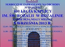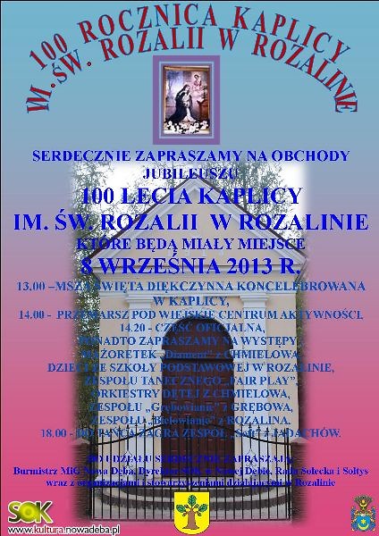 Organizatorzy wraz z mieszkańcami Rozalina serdecznie zapraszają na obchody 100-lecia Kaplicy im. Św. Rozalii. Doniosła uroczystość odbędzie się 8 września 2013 r. Rozpocznie się Mszą Świętą Dziękczynną w Kaplicy o godzinie 13.00. Dalsze uroczystości odbędą się przy Wiejskim Centrum Aktywności. Tam wystąpią dzieci ze Szkoły Podstawowej w Rozalinie, zespoły: muzyczne, taneczne oraz ludowe. Organizatorzy zapewniają dobrą zabawę. Około godziny 18.00 do tańca przygrywał będzie zespół muzyczny „Soft” z Jadachów. Do udziału zapraszają:Burmistrz MiG Nowa Dęba, Dyrektor SOK w Nowej Dębie, Rada Sołecka, Sołtys, Radny Rady Miejskiej, Zespół „Bielowianie”, Koło Gospodyń Wiejskich, Ochotnicza Straż Pożarna, Towarzystwo Krzewienia Kultury Lasowiackiej Bielowianie w Rozalinie.