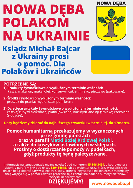 Jak wiemy, od wielu lat nowodębianie pomagali Polakom na Kresach. Szczególnie teraz o taką pomoc zwrócił się do nas przyjaciel Nowej Dęby ks. Michał Bajcar, który pozostał w Ukrainie wraz z grupą Polaków oraz Ukraińców. Potrzeby są ogromne, stąd też zwracamy się z serdeczną prośbą do mieszkańców miasta i gminy o przekazanie darów, które w najbliższym czasie trafią na Ukrainę do konkretnej parafii. Pełna lista potrzeb zamieszczona jest poniżej tekstu.