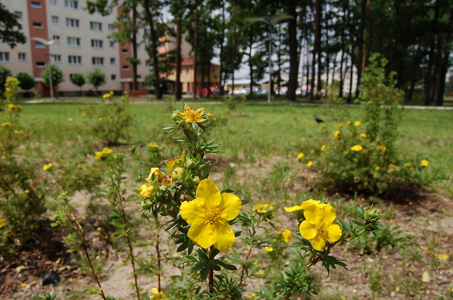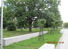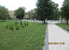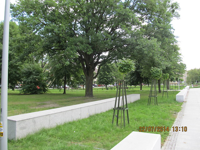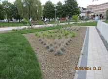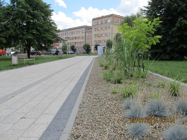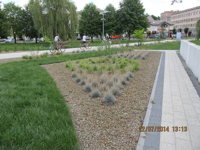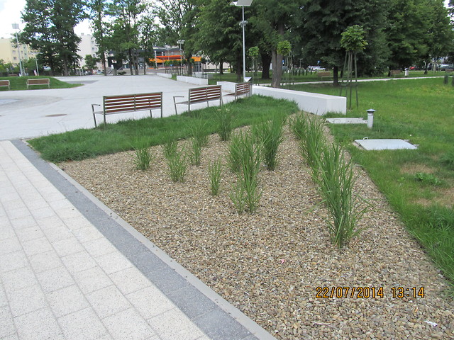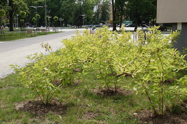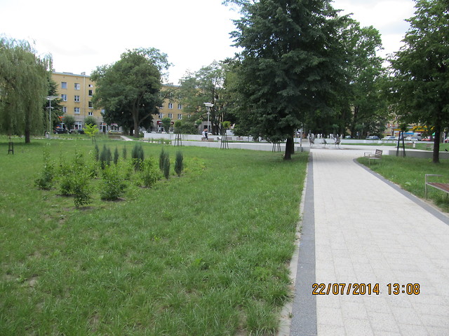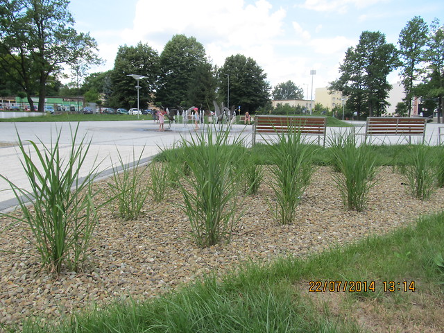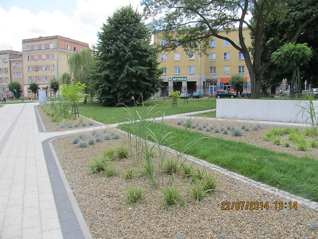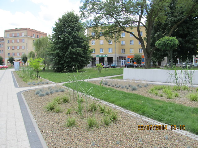 Coraz wyraźniej zarysowują się założenia zieleni na zrewitalizowanym placu mjr Gryczmana. Kwiatostany niebieskich turzyc pięknie kontrastują z wysokimi miskantami, które jeszcze nie pokazały w pełni swojego uroku. Żółte pięciorniki sąsiadują z czerwonymi berberysami. Niewielkie jeszcze kule klonów i akacji tworzą ładne szpalery. Warto zwrócić uwagę na rzadkie gatunki drzew jak choćby miłorząb japoński lub sosna wejmutka. Ładnie też prezentuje się dereń biały i wiele innych.